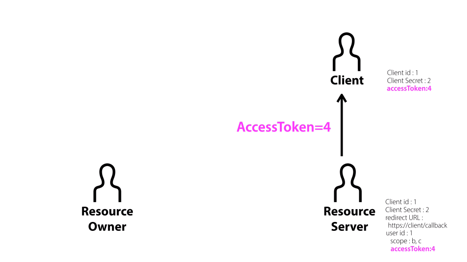 앞으로 Client가 accessToken=4로 접근하면 Resource Server는 갖고 있던 accessToken가 user_id=1에 해당하는 회원에게 발급한 것을 확인하고, 유효한 기능(b, c)에 대해 접근을 허용한다.