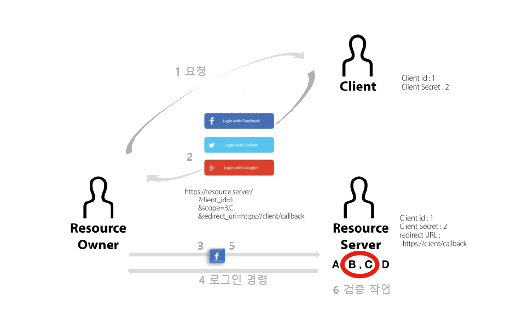 - Resource Server : 제어하고자 하는 자원을 갖고 있는 서버 (ex. Facebook, Twitter)
