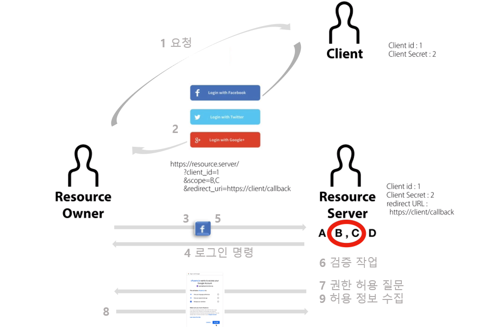 7. 비교 검증을 마치면 Resource Owner에게 scope에 해당하는 권한을 Client에게 부여할 것인지 확인 메세지를 전송하게 된다.