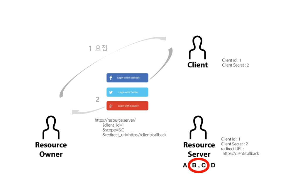 - Resource Server : 제어하고자 하는 자원을 갖고 있는 서버 (ex. Facebook, Twitter)