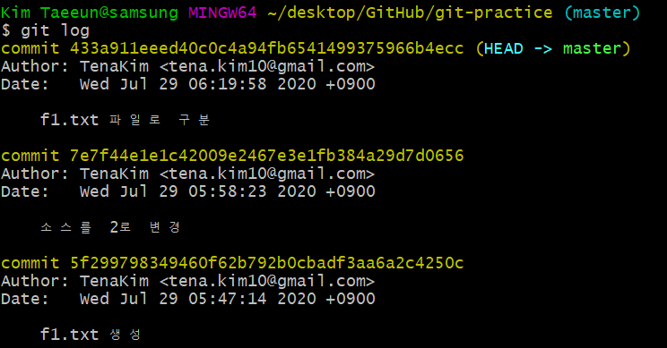 이제부터의 버전들은 이름과 이메일을 포함한 버전이 되므로 누가 작업했는지 구분할 수 있다.