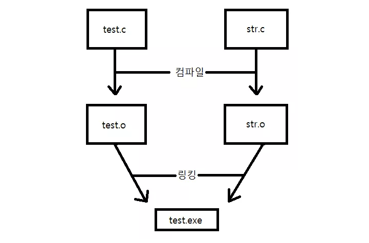 덕분에 test.c 에서 다른 파일에서 작성한 함수를 호출하더라도 str.c 의 함수를 이용할 수 있게 되는 것이다.