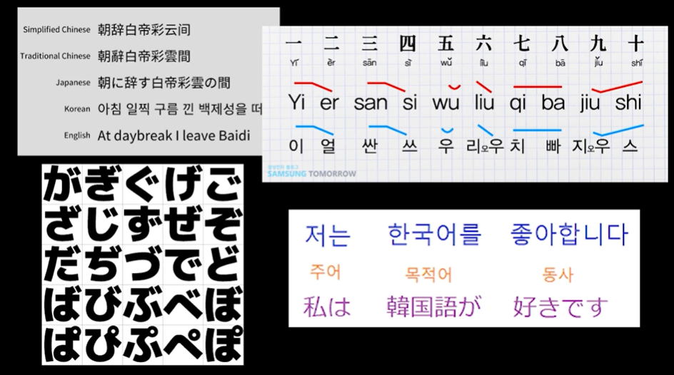 한편 한국어, 일본어, 중국어 등 모음과 자음이 분리된 보다 복잡한 언어는 1byte의 ASCII Table로 처리할 수 없다.