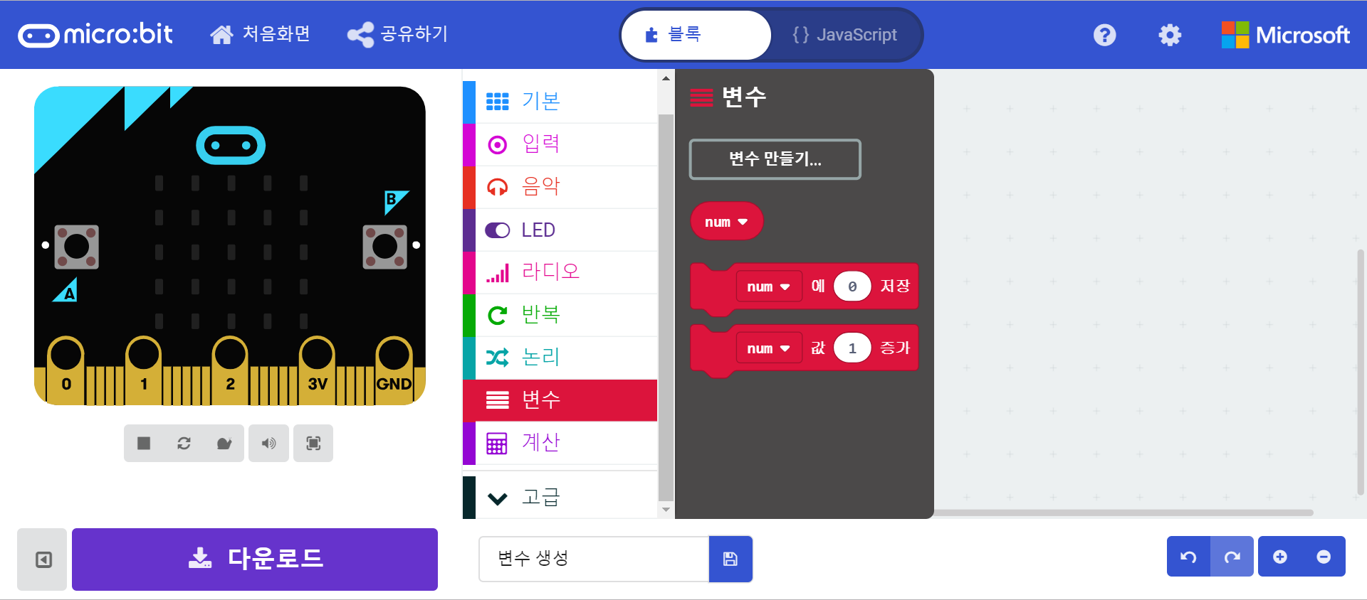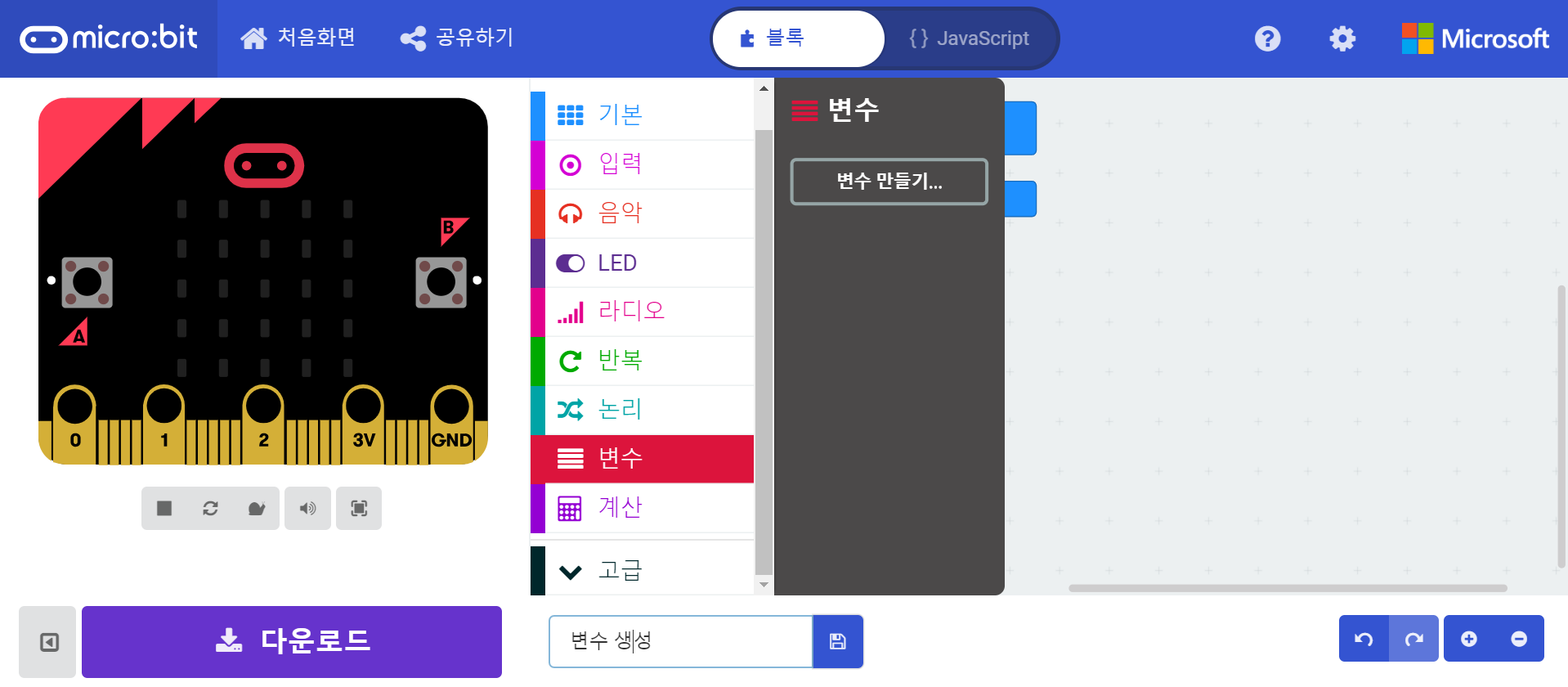 마이크로비트 코딩을 할 때에도 변수를 만들 수 있다.