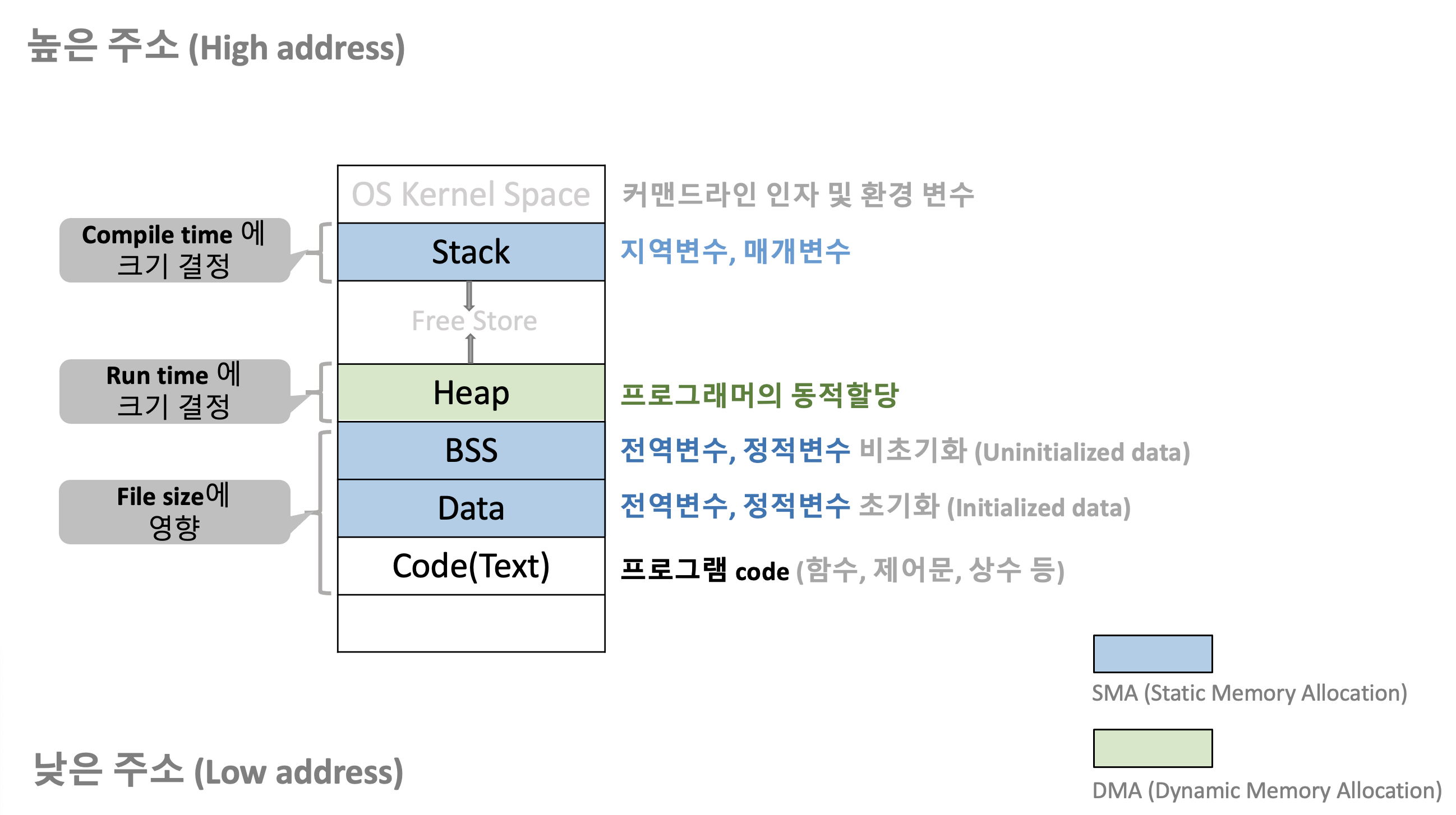 따라서 컴퓨터의 운영체제는 프로그램의 실행을 위해 다양한 메모리 공간을 제공, 할당한다.