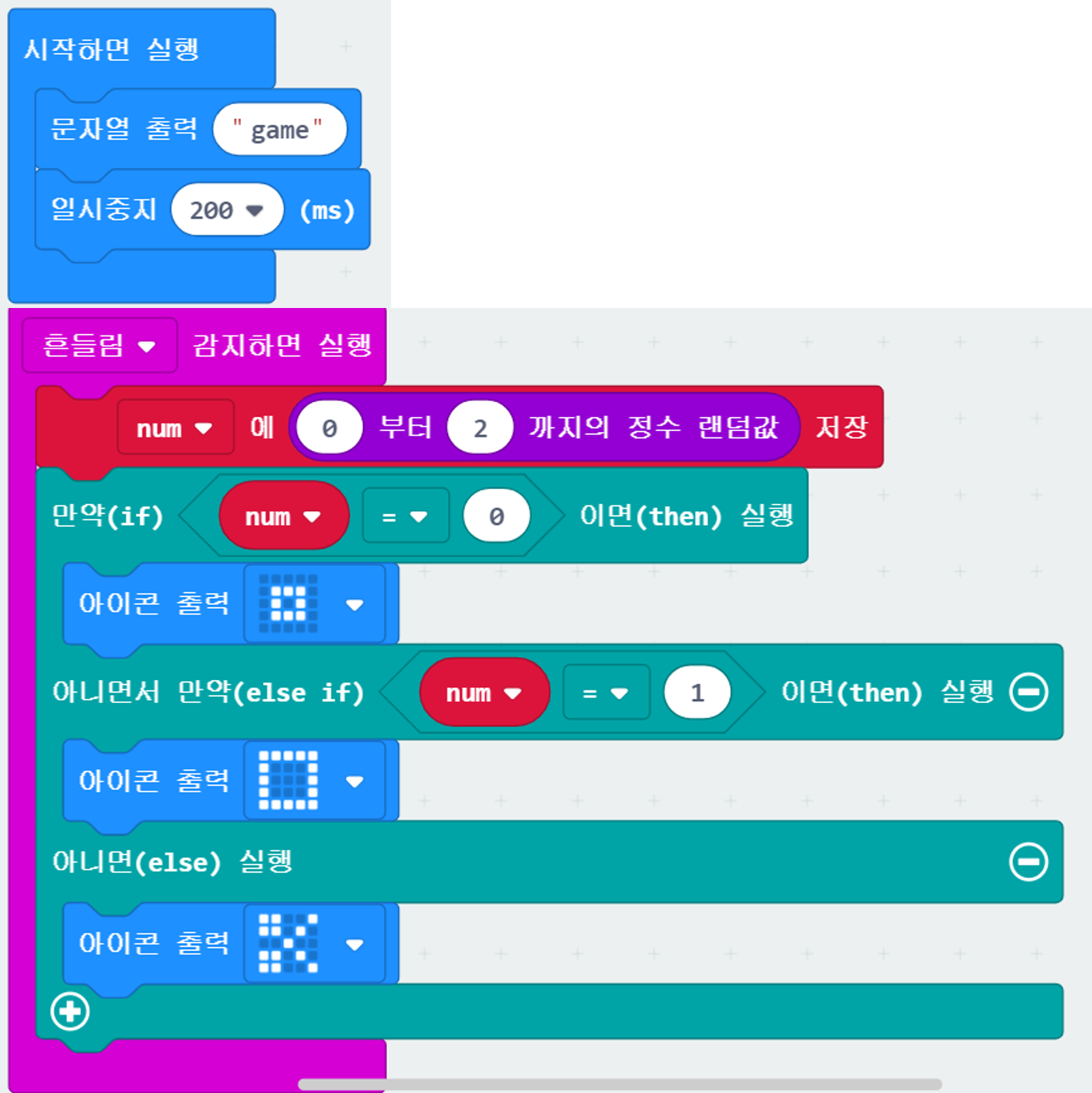 마이크로비트를 흔들면 num변수에 0부터 2까지의 정수를 랜덤으로 저장한다.
