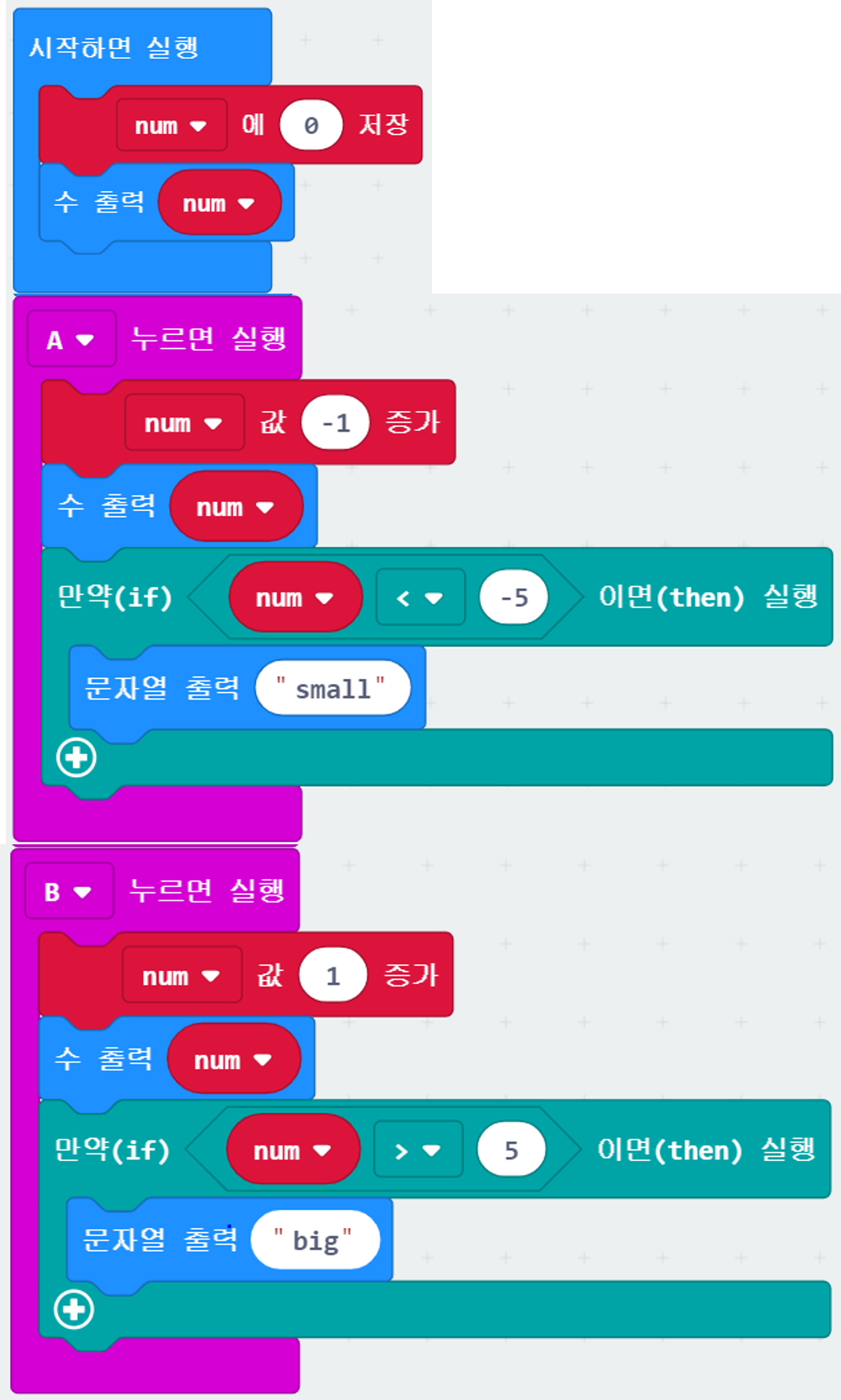 예제 11번과 똑같이 하되 B버튼을 누를 때 값이 5보다 올라가면 'big'이라고 출력하는 코드다.