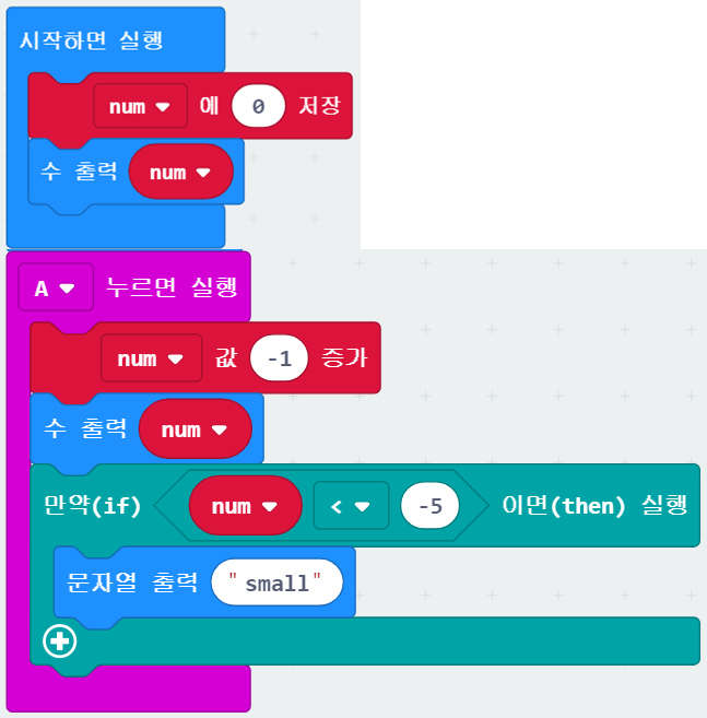 A버튼을 누를 때마다 num값은 -1씩 증가되는데, 값이 -5보다 내려가면 'small'이라고 출력하는 코드였다.