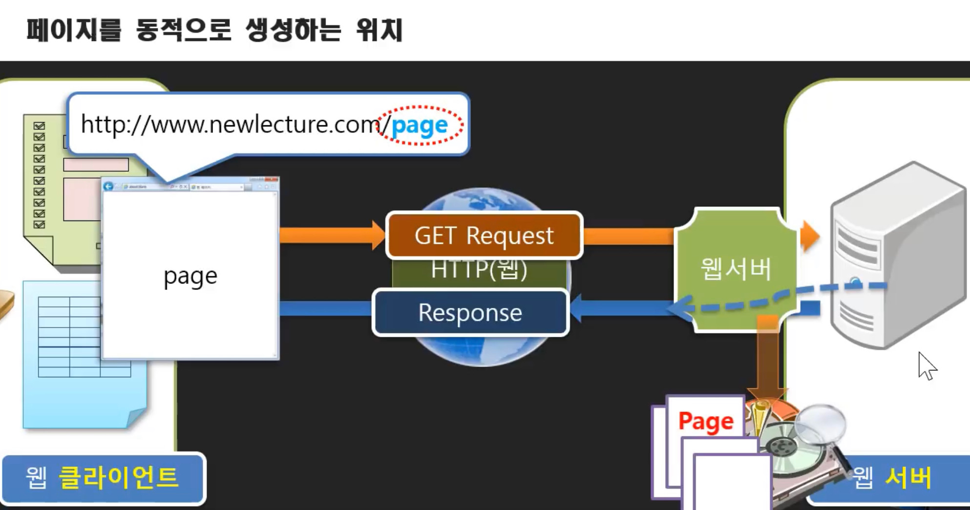 클라이언트가 문서를 요청하면 웹 서버는 요청받은 문서를 찾아서 돌려준다. 문서는 브라우저와 웹 서버에서 다뤄진다. 문서는 웹 퍼블리셔가 만든다. 때로는 문서가 서버쪽의 프로그램으로 만들어지기도 한다. 그것을 동적인 문서라고 한다.