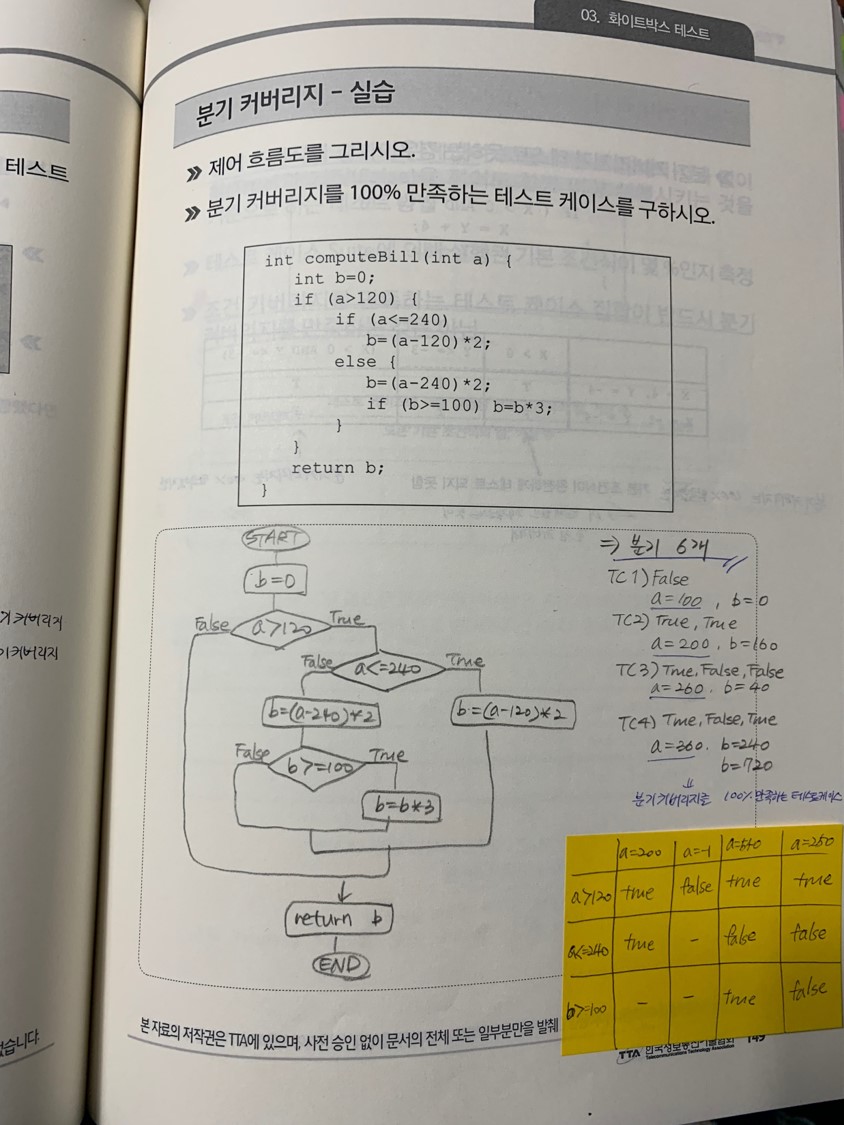 이런 식으로 예제를 같이 풀어본다. 위의 사진은 구조기반 테스트(화이트박스 테스트)에서 배우는 분기 커버리지를 이용한 테스트케이스 설계에 관한 부분이다.