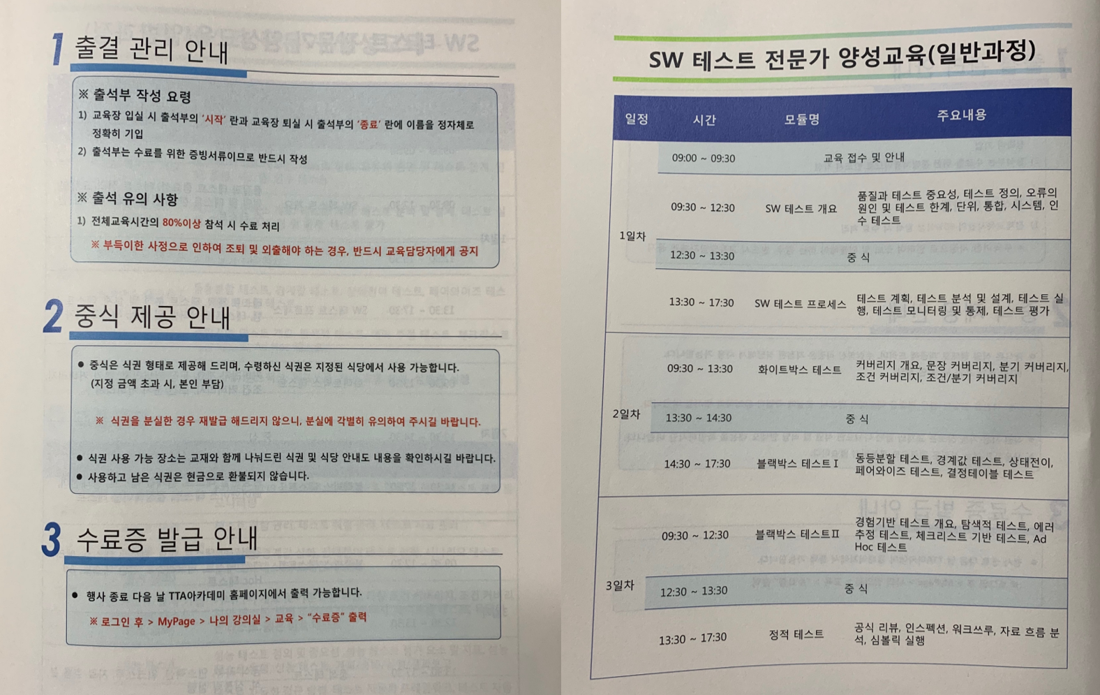 SW 테스트 전문가(CSTS) 교육은 수료증을 발급하기 때문에 교육 시작과 끝에 출석 서명을 해야 한다. 80% 이상의 출석을 하면 TTA아카데미 홈페이지에서 MyPage>나의강의실에서 수료증을 발급 받을 수 있다.
