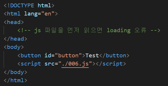 html에서 <script src="./006.js"></script> 코드를 제일 밑으로 내린다.