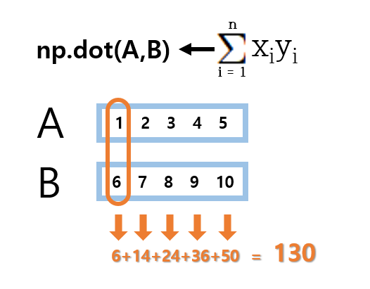 np.dot()의 연산 원리는 다음과 같다. 아래 그림은 1차원 배열 연산에 해당하는 흐름이다.