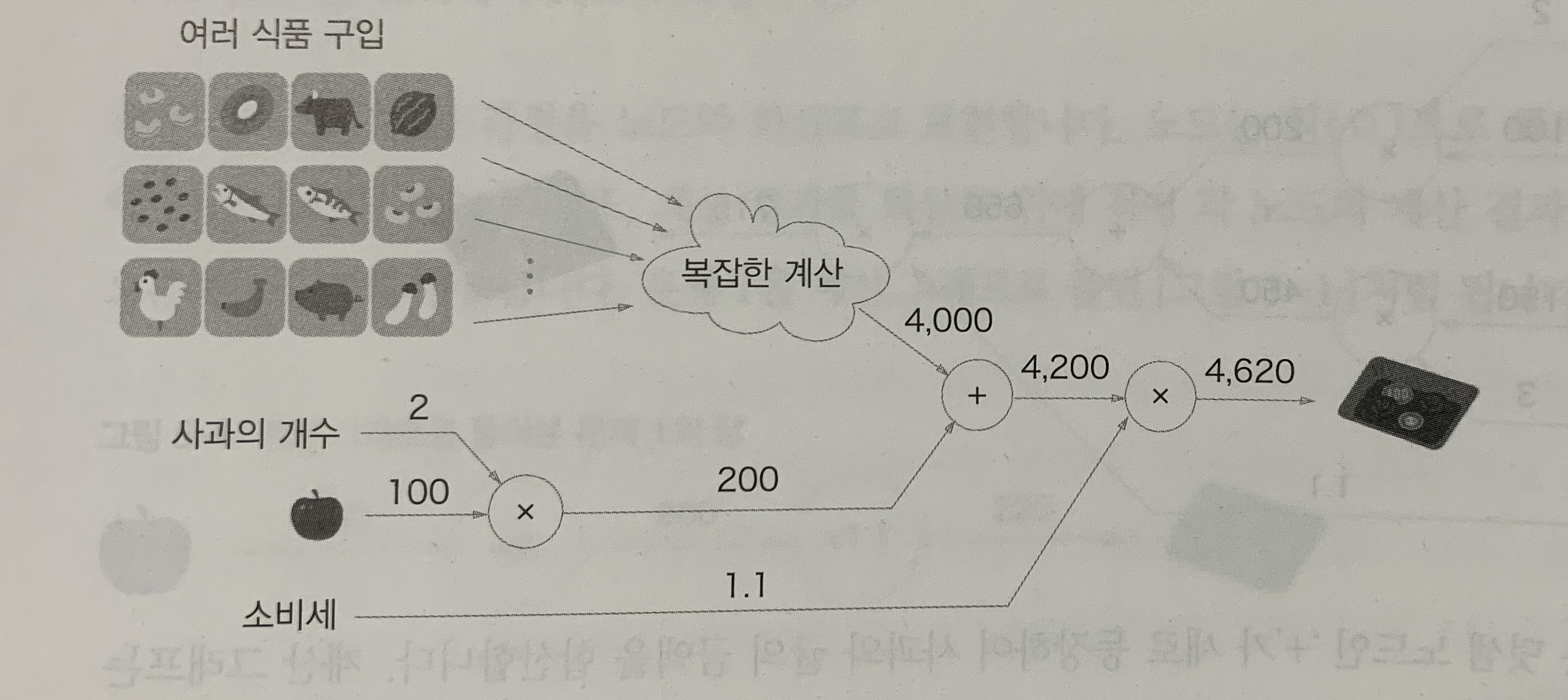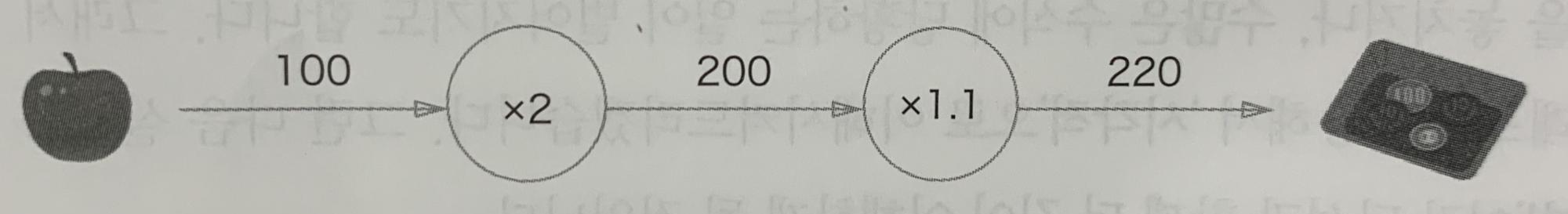 가령 슈퍼마켓에서 사과 2개를 포함한 여러 식품을 구입하는 경우에 아래와 같은 계산 그래프로 나타낼 수 있다.