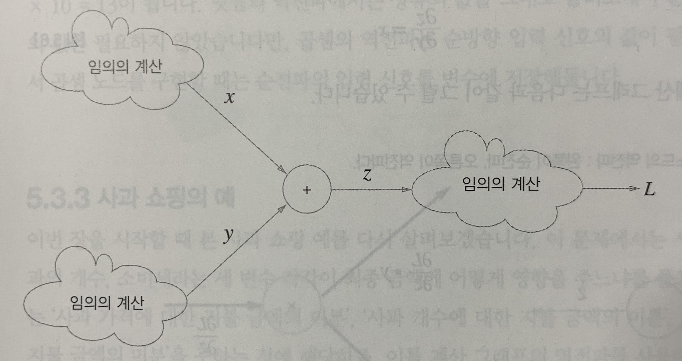 이번 절에서는 '+'와 'x' 등의 연산을 예로 들어 역전파의 구조를 보겠다.