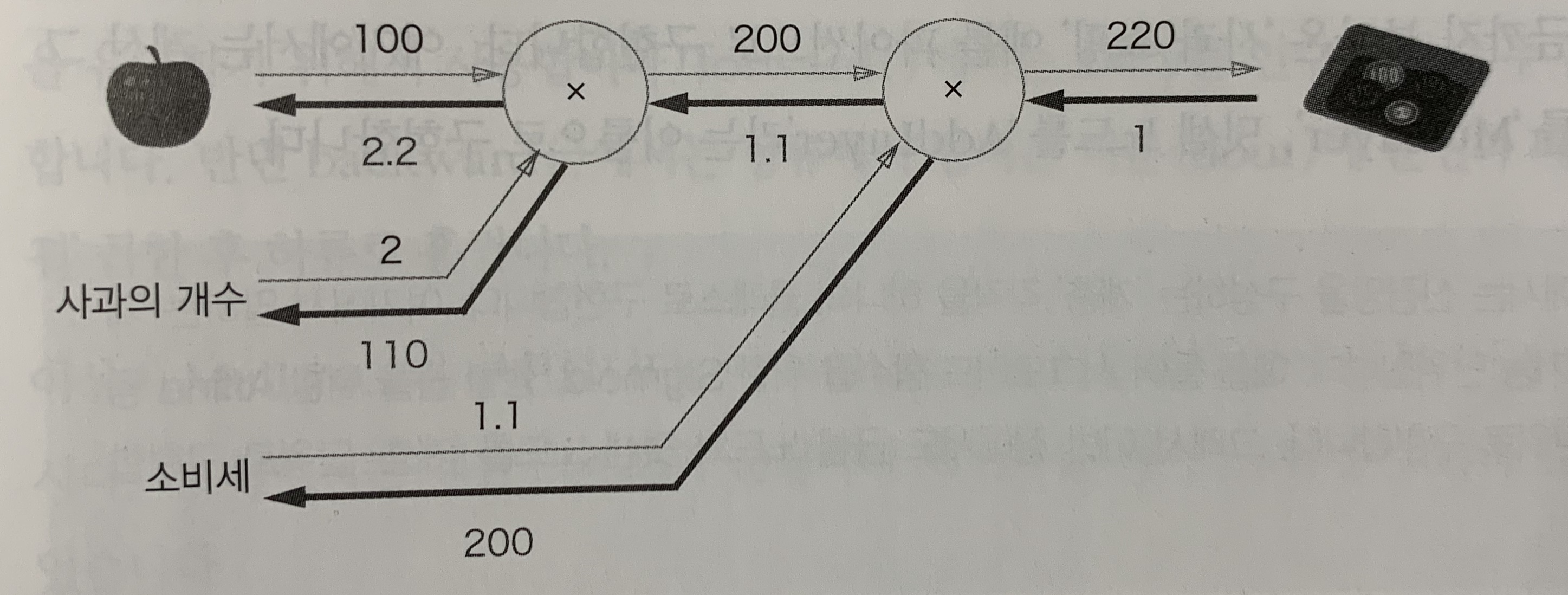 사과 가격의 미분은 2.2, 사과 개수의 미분은 110, 소비세의 미분은 200이다.