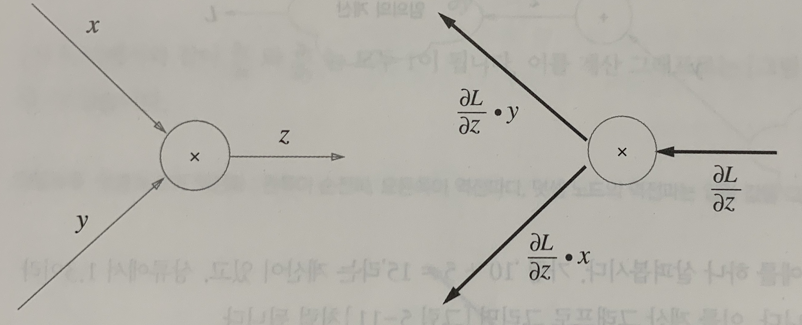 곱셈 노드의 역전파에서는 입력 신호를 서로 바꿔서 하류로 흘린다.