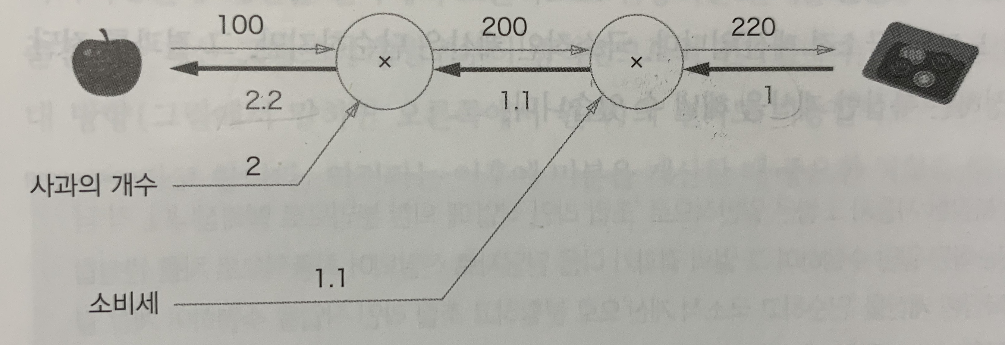 오른쪽에서 왼쪽으로 '1->1.1->2.2' 순으로 미분 값을 전달한다. 이 결과로부터 '사과 가격에 대한 지불 금액의 미분' 값은 2.2라 할 수 있다.