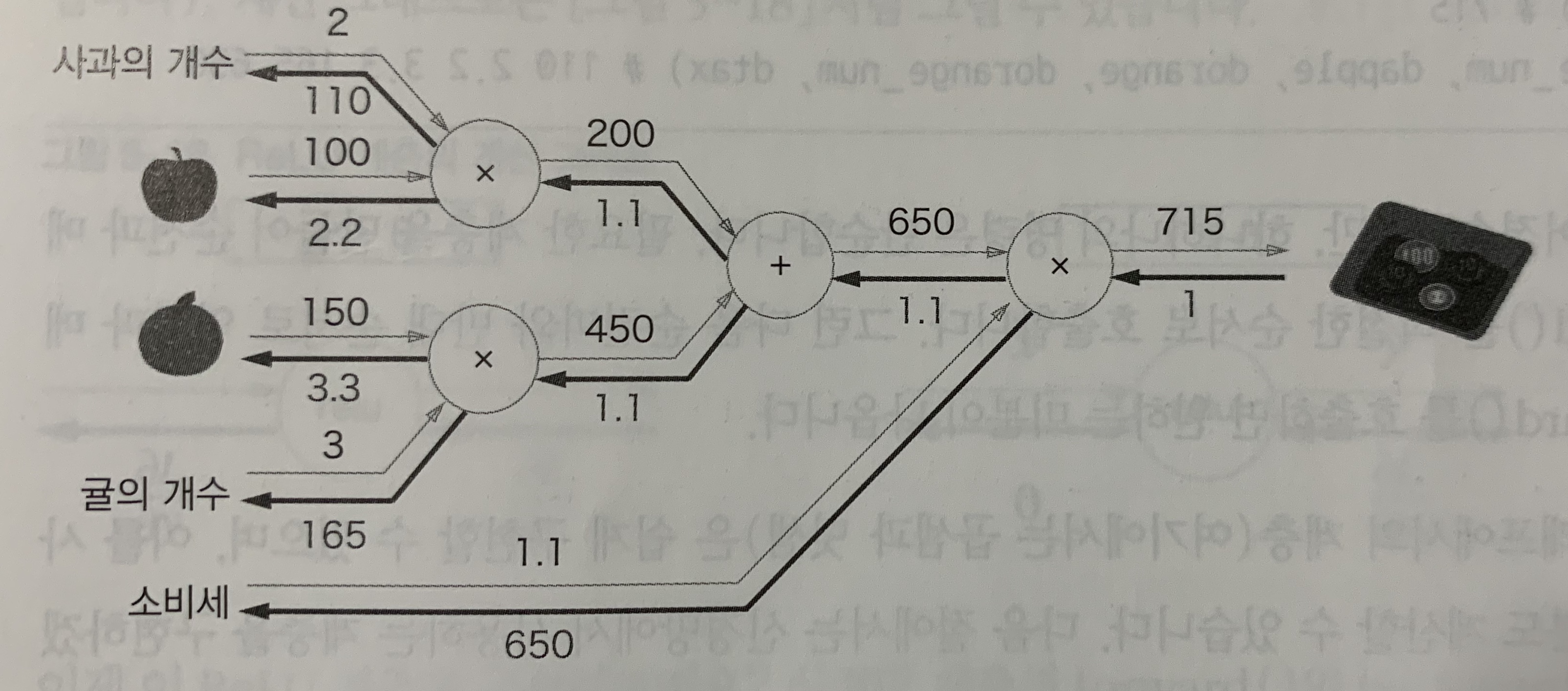 오른쪽에서 왼쪽으로 '1->1.1->2.2' 순으로 미분 값을 전달한다. 이 결과로부터 '사과 가격에 대한 지불 금액의 미분' 값은 2.2라 할 수 있다.