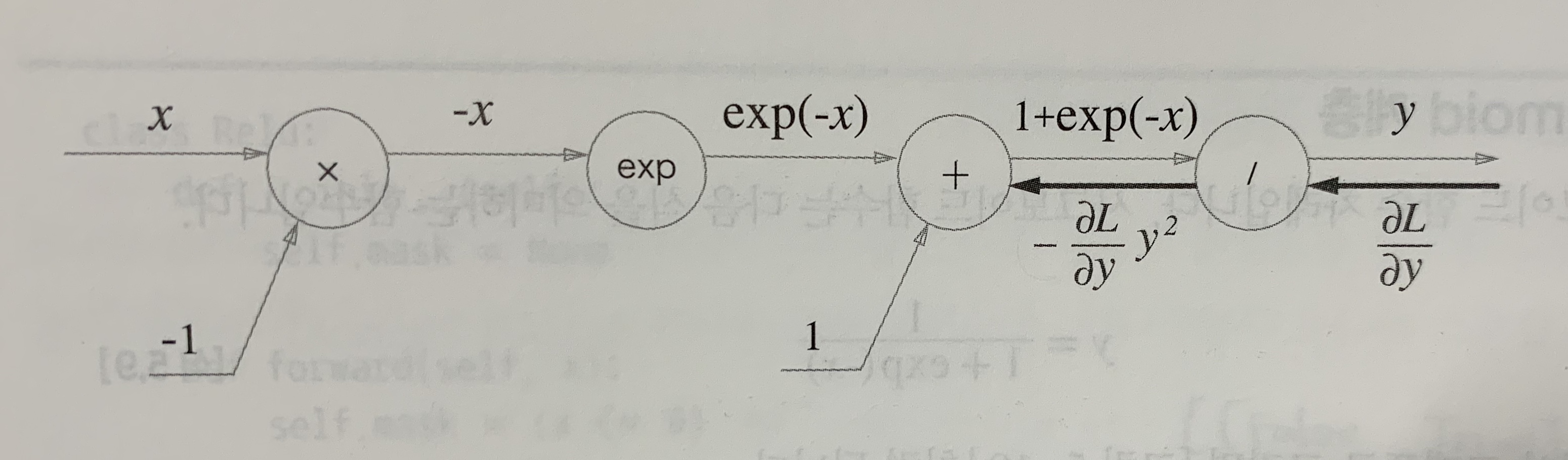 'exp' 노드는 y = exp(x) 계산을 수행하고 '/' 노드는 y = 1/x 계산을 수행한다.