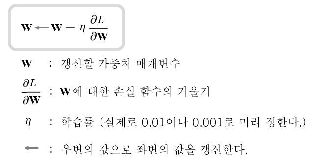매개변수의 기울기를 구해서, 기울어진 방향으로 매개변수 값을 갱신하는 일을 반복하여 최적값에 다가갔다.