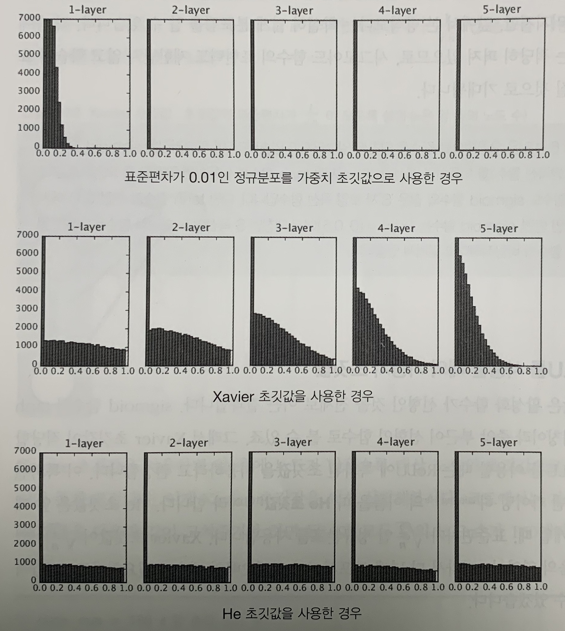 이 실험은 층별 뉴런 수가 100개인 5층 신경망에서 활성화 함수로 ReLU를 사용했다.