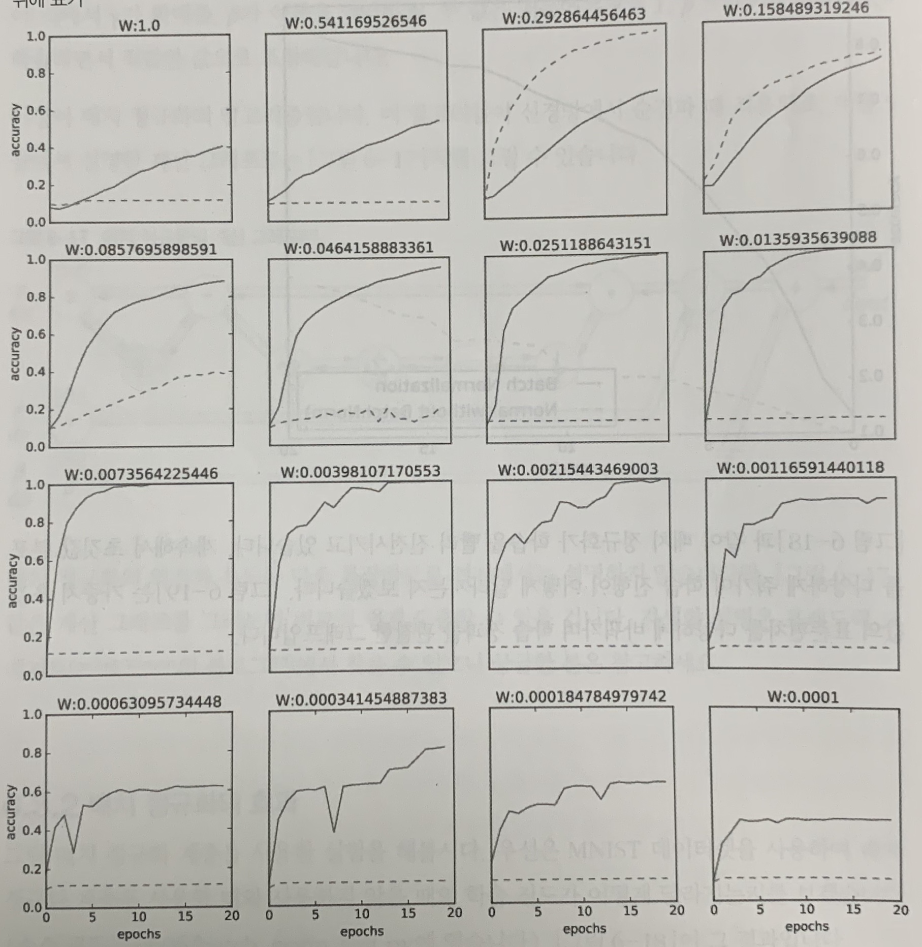 실제로 배치 정규화를 이용하지 않는 경우엔 초깃값이 잘 분포되어 있지 않으면 학습이 전혀 진행되지 않는다.