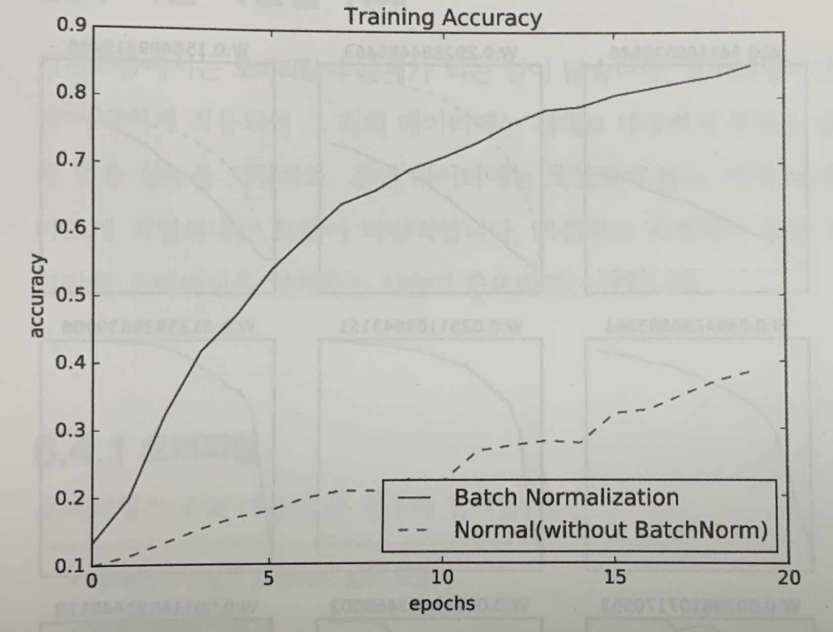 배치 정규화가 학습을 빨리 진전시키고 있다.