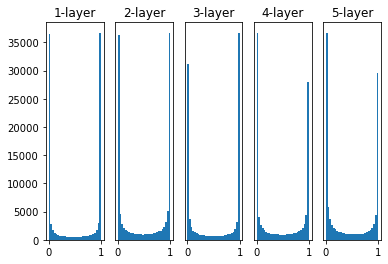 각 층의 활성화값들이 0과 1에 분포한다.