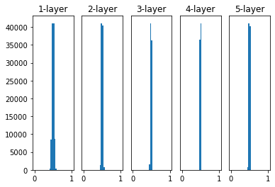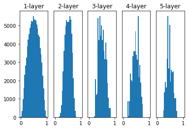 표준편차를 0.01로 한 정규분포의 경우 각 층의 활성화값 분포는 아래처럼 된다.
