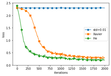 - He 초깃값도 학습이 순조롭게 이뤄진다. 학습 진도가 더 빠르다.