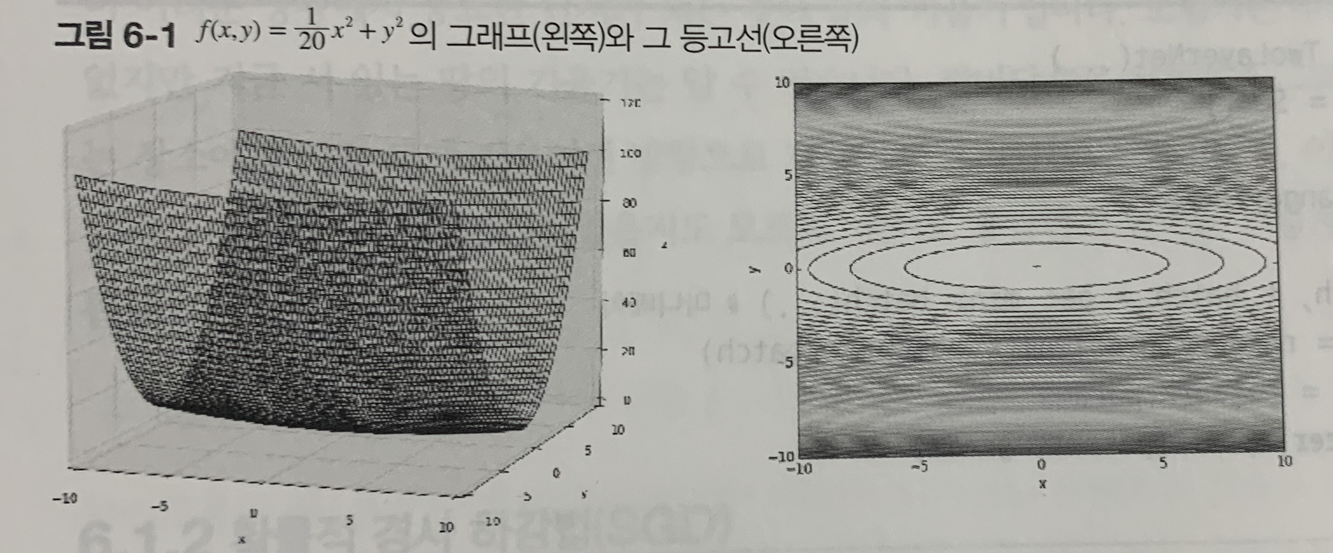 주의할 점은 함수 식에서 최솟값이 되는 장소는 (x, y) = (0, 0)이지만, [그림 6-2]에서 보여주는 기울기 대부분은 (0, 0) 방향을 가리키지 않는다는 것이다.