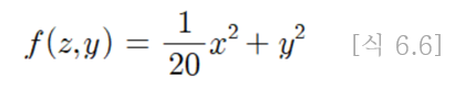 즉, SGD의 단점은 비등방성(anisotropy) 함수(방향에 따라 성질, 즉, 여기에서는 기울기가 달라지는 함수)에서는 탐색 경로가 비효율적이다.