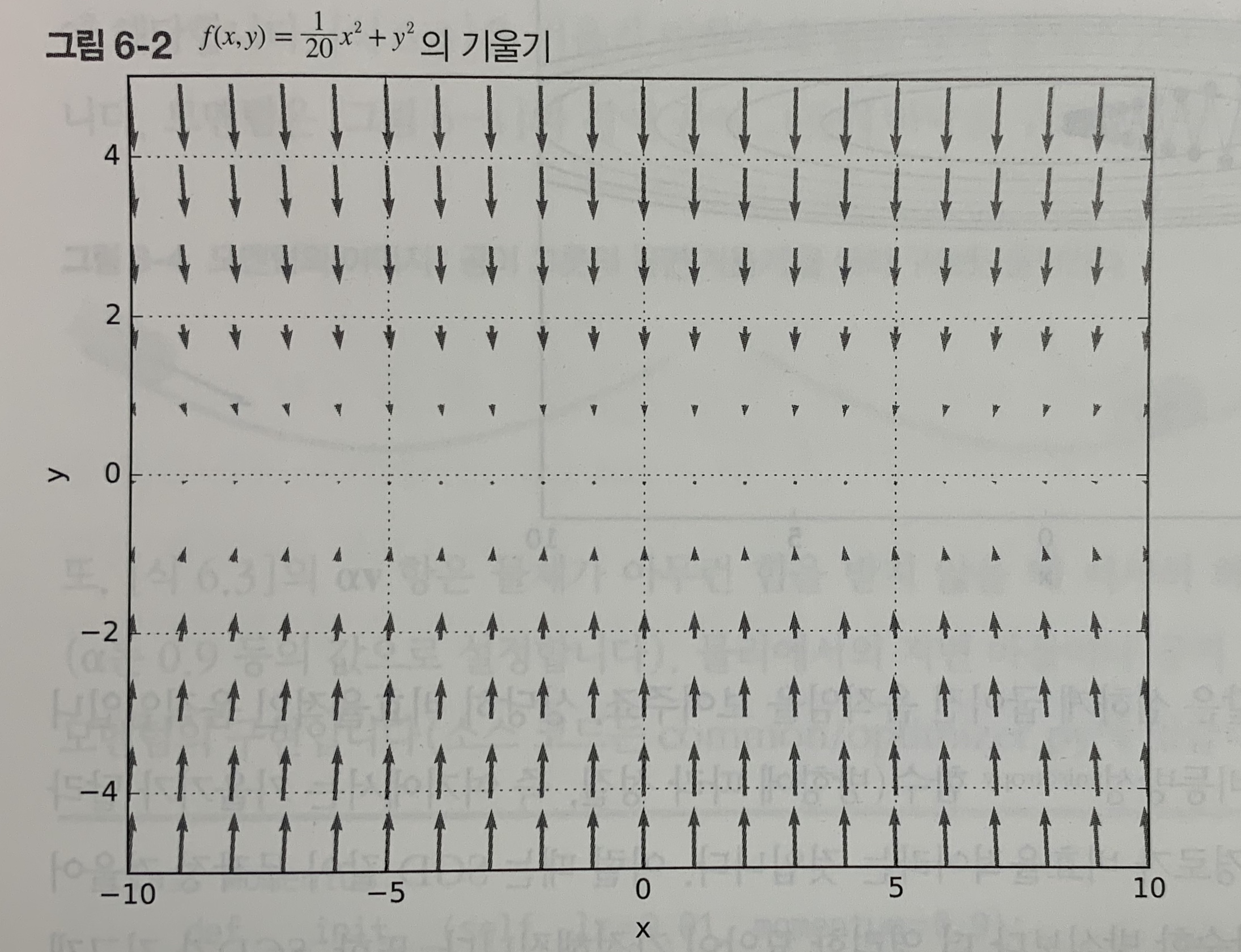 주의할 점은 함수 식에서 최솟값이 되는 장소는 (x, y) = (0, 0)이지만, [그림 6-2]에서 보여주는 기울기 대부분은 (0, 0) 방향을 가리키지 않는다는 것이다.