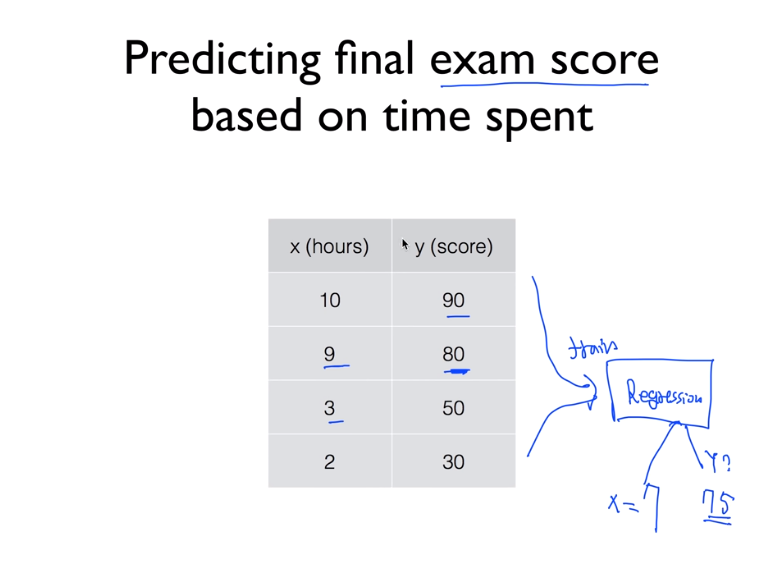 Predicting exam score는 이전의 시험친 사람들의 점수와 시간 데이터을 가지고 학습해서 점수를 예측한다.