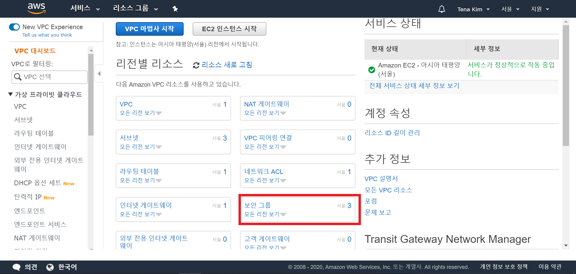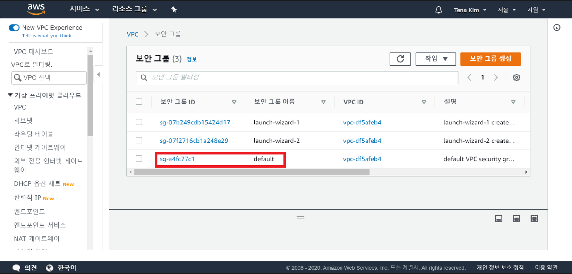 1. AWS의 VPC 콘솔을 열어 보안그룹을 클릭한다.