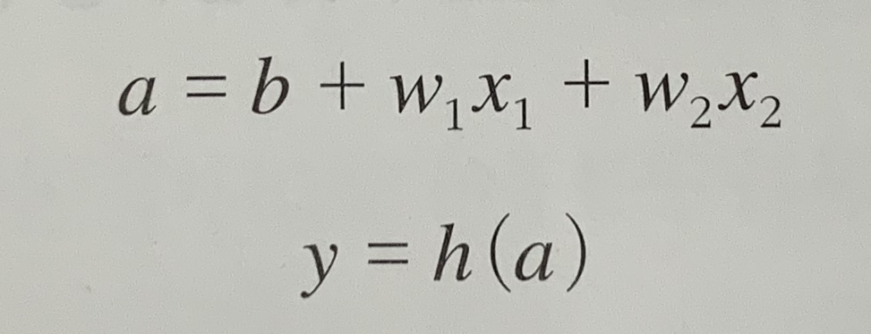 3.1.2.에서 간결화한 수식은 가중치가 곱해진 입력 신호의 총합을 계산하고 그 합을 활성화 함수에 입력해 결과를 내는 2단계로 처리된다. 이를 한번 더 2개의 식으로 나눌 수 있다.