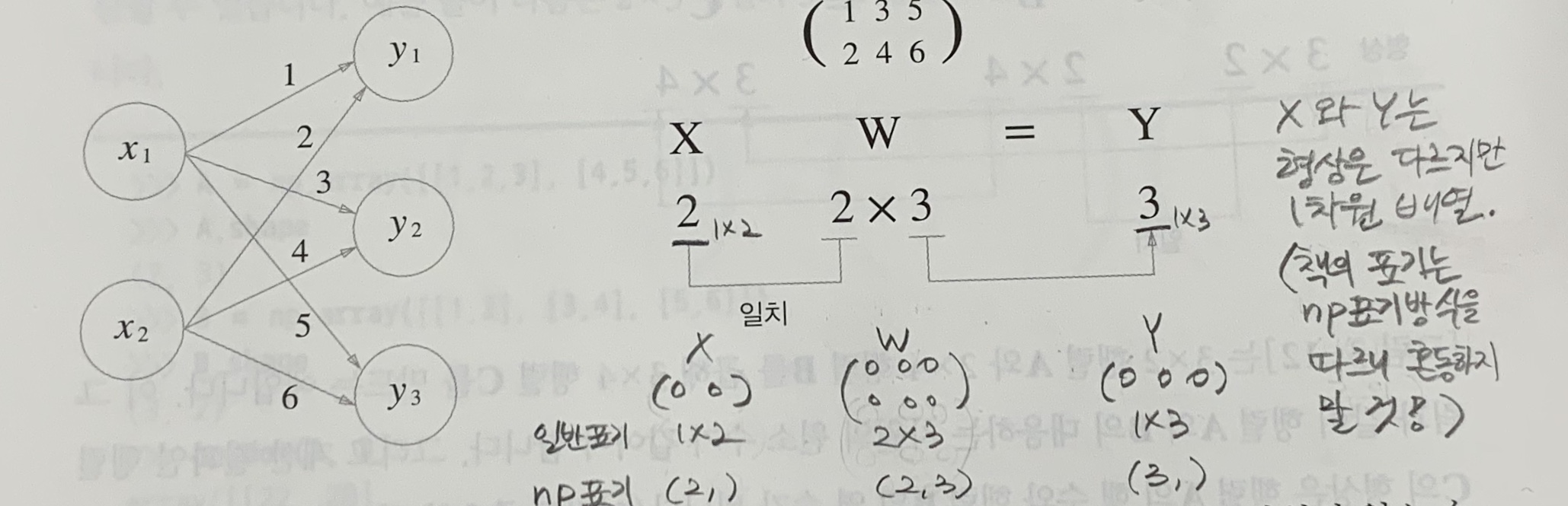 다차원 배열의 스칼라곱을 구해주는 np.dot 함수를 사용하면 이처럼 단번에 결과 Y를 계산할 수 있다.