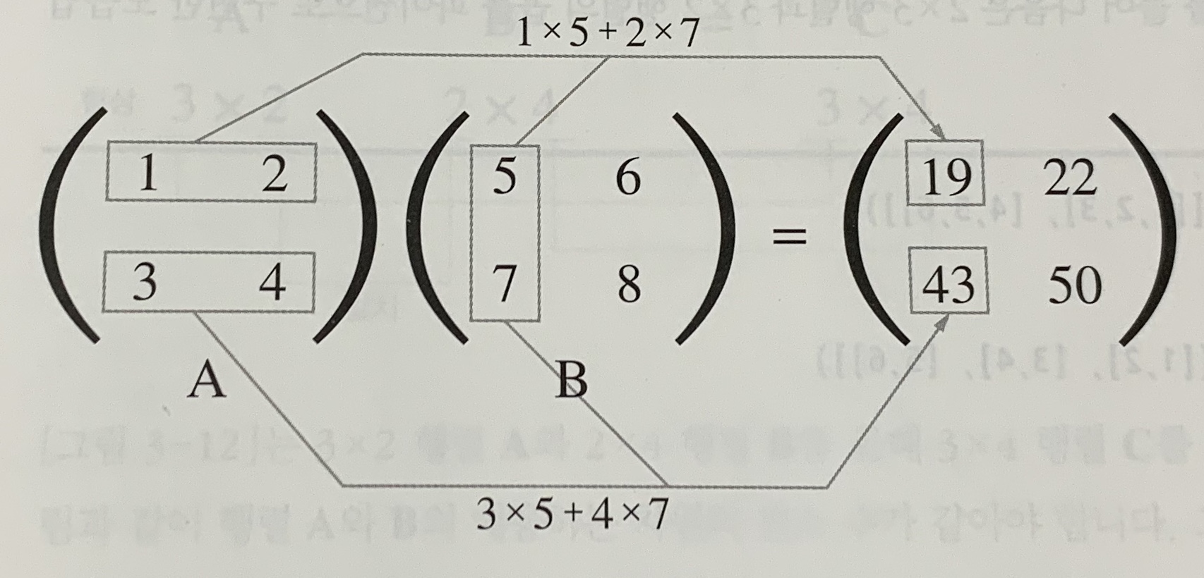 A와 B는 2X2 행렬이며, 이 두 행렬의 곱은 넘파이 함수 np.dot()으로 계산한다.