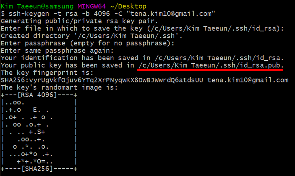 SSH Key 값을 새로 생성했을 때 public key가 /c/Users/Kim Taeeun/.ssh/id_rsa.pub에 저장됐다는 정보가 있었다.