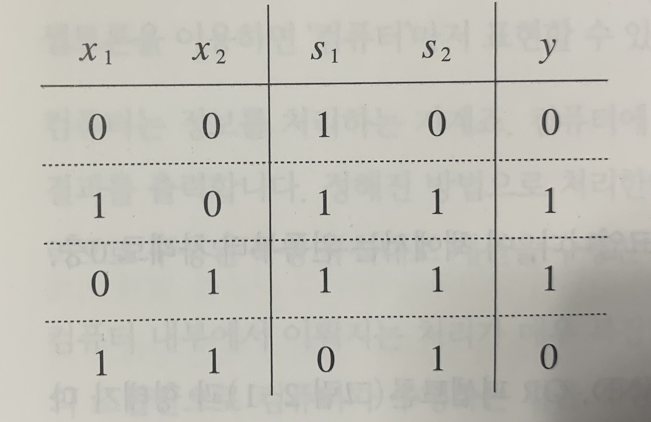 NAND의 출력을 s1, OR의 출력을 s2로 해서 진리표를 만들면 위처럼 된다.