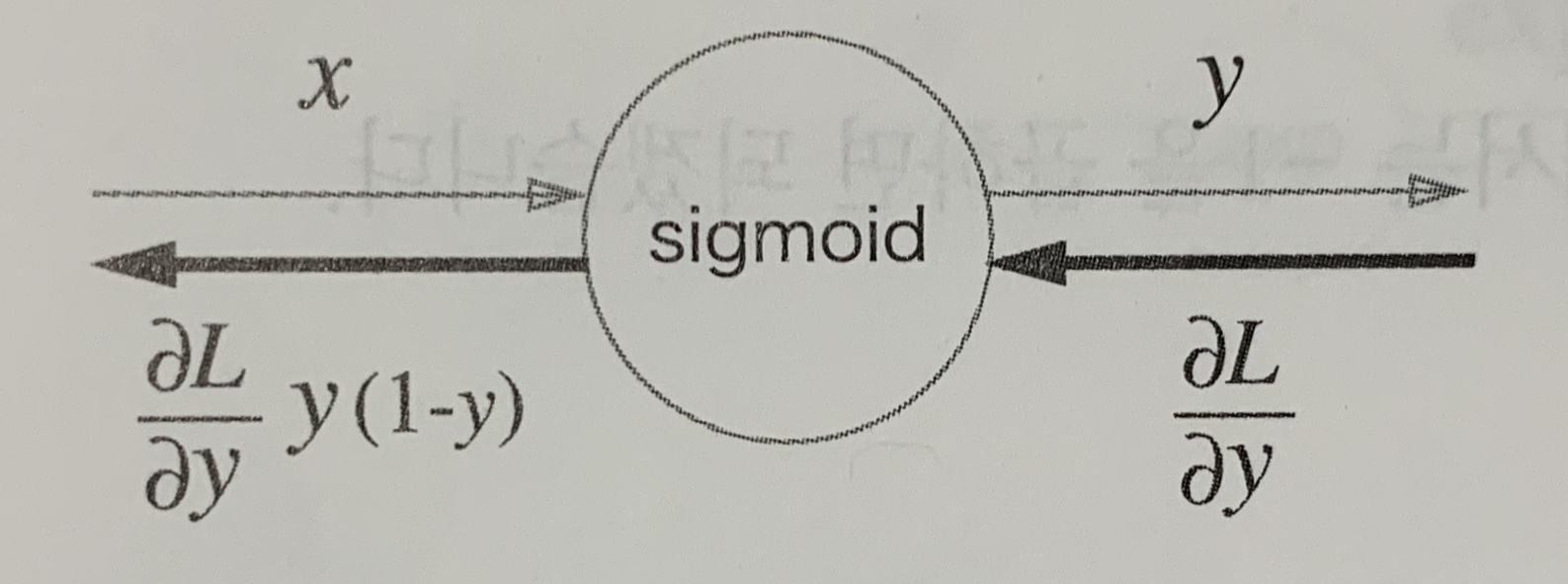 왼쪽 하단의 역전파 최종 출력이 하류 노드로 전파된다. 이 값은 순전파의 입력 x와 출력 y만으로 계산할 수 있다.